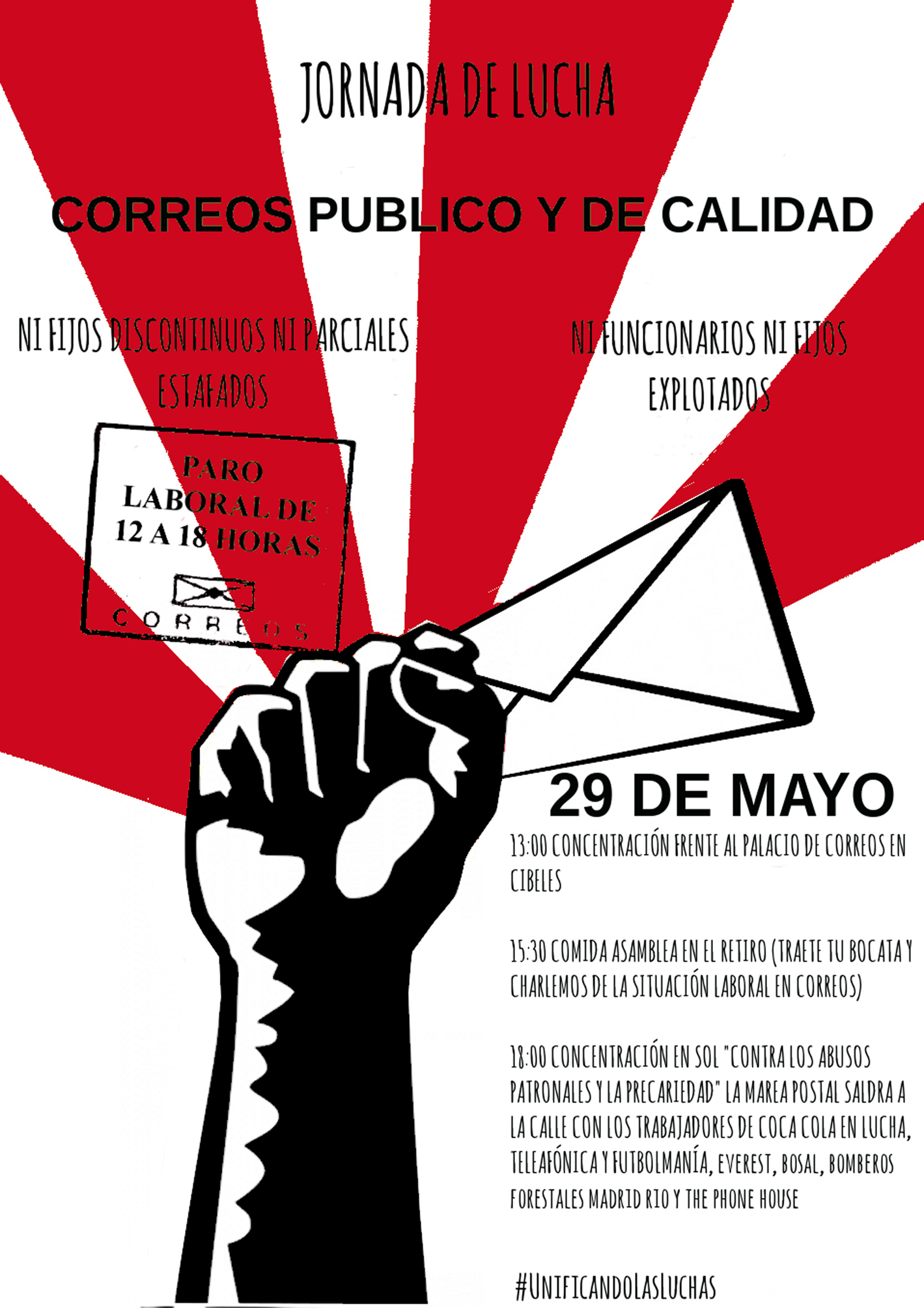 - 18:00h: Concentración en la Puerta del Sol “Contra los abusos patronales y la precariedad”. La marea postal saldrá a la calle junto a los trabajadores de Coca-Cola en lucha, Teleafónica, Futbolmanía, Everest, Bosal, Bomberos forestales, Madrid Río, The Phone House, Bankia, Panrico…