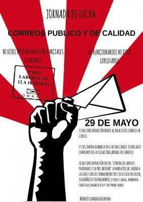 Por todo ello, CGT Correos de Madrid convoca y participará en la jornada de lucha del 29 de mayo y anima a todos los compañeros y compañeras a sumarse a las siguientes citas: