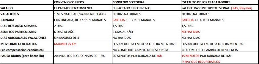 Como ya hicimos público, en la 2ª reunión oficial de la mesa de negociación del IV convenio colectivo, se desprende la intención de la empresa de que el nuevo convenio no tenga cláusula de ultraactividad. ¿Qué significa esto? Que el convenio colectivo tendría un plazo máximo improrrogable de vigencia y eficacia. Una vez terminado este plazo, si no hubiese nuevo pacto para nuevo convenio, los empleados de correos, nos regiremos por un convenio sectorial, en el caso de reparto, sería el convenio colectivo estatal de entrega domiciliaria, y en su defecto, por el estatuto de los trabajadores. De esta forma, la empresa adquiere una posición de poder insólita, pudiendo chantajear a los trabajadores y amenazarnos con rebajar dramáticamente nuestros salarios y condiciones laborales si no se firmase un convenio a gusto de la empresa, cuando este estuviera a punto de finalizar. ¿Cómo nos afecta a los trabajadores? Perdiendo derechos, (ver tabla)