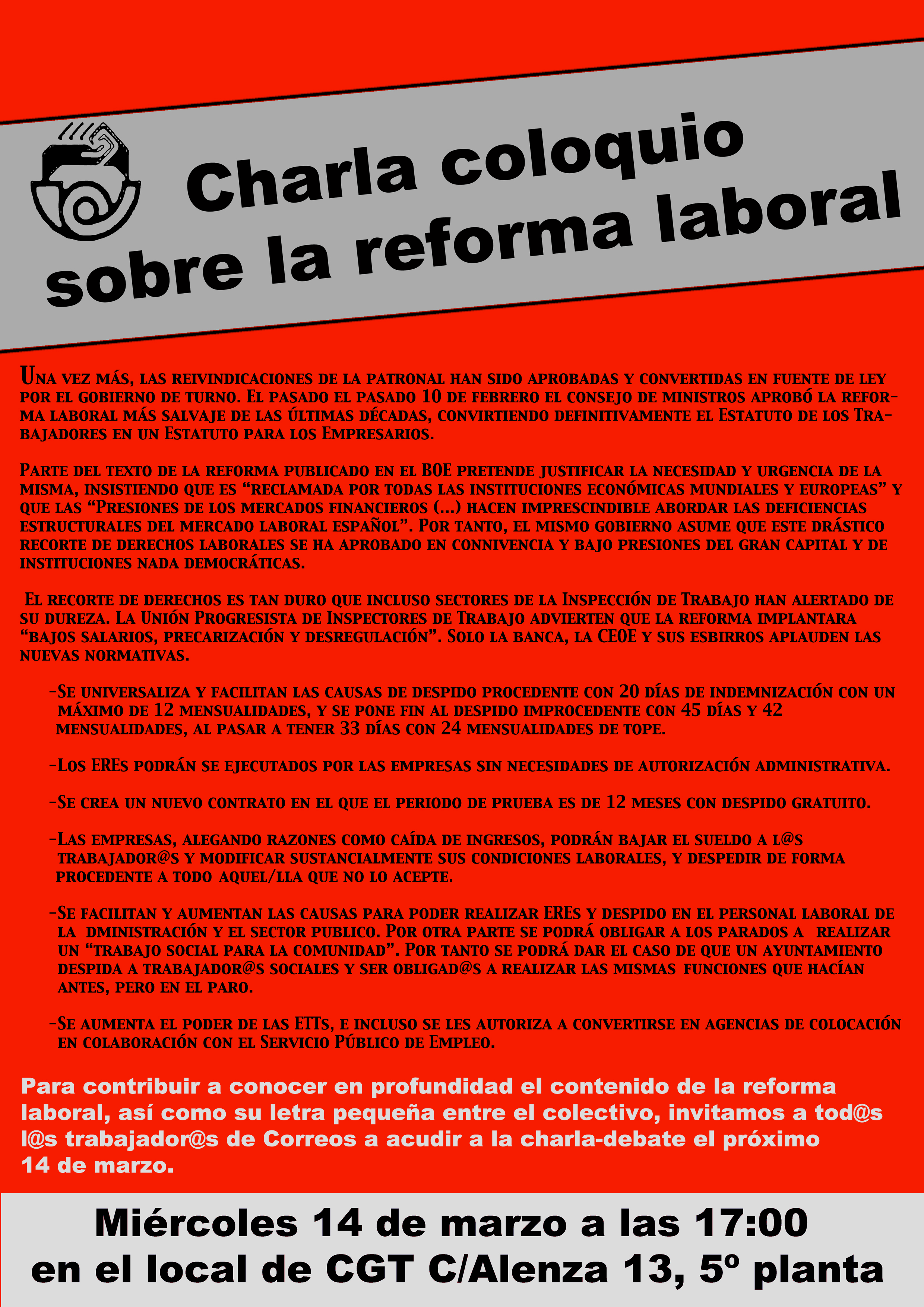 El miércoles 14 de marzo practicaremos una charla-debate sobre la reforma laboral y las modificaciones que esta reforma supone. Trataremos la recesión en los derechos de l@s trabajador@s, y como afecta esta reforma a las administraciónes públicas. Invitamos a tod@s l@s trabajador@s de Correos a asistir y a participar.