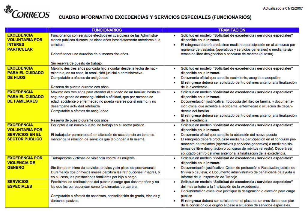 Cuadro informativo de excedencias y servicios especiales.