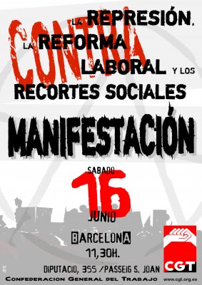 · Manifestación de toda la CGT en Barcelona. Será el próximo 16 de junio y saldrá del cruce de la calle Diputació con Paseig de Sant Joan a las 11.30 horas.