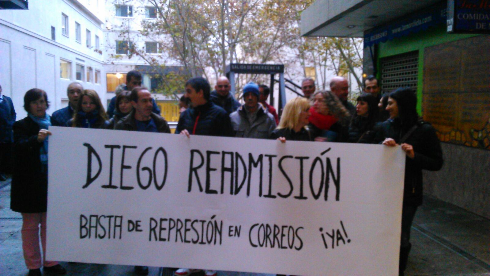 Un@s 50 compañer@s de Diego en sus dos últimos destinos (Aravaca desde febrero de 2016, y distrito 20 los últimos 9 años) han firmado una hoja pidiendo a Correos la readmisión del compañero y en un ejemplo de solidaridad, el 90% de la plantilla del distrito 20 ha decidido parar y acudir al Juicio de Diego celebrado hoy, 12 de diciembre, para expresarle nuestro apoyo.